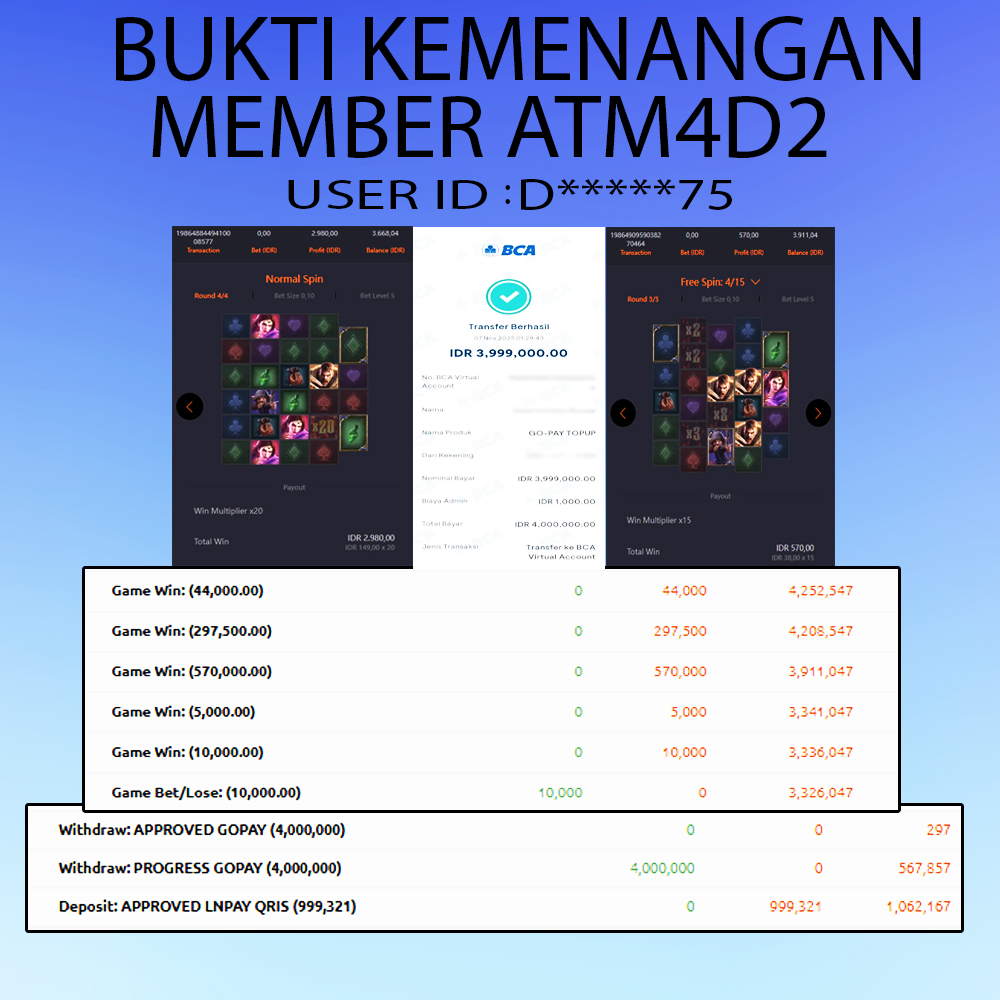 ATM4D2 dikenal sebagai situs terpercaya yang selalu menghadirkan pengalaman bermain slot online yang aman, fair, dan berlisensi resmi. Di sini, kami tidak hanya sekadar memberikan janji, tapi bukti nyata berupa slip kemenangan yang dapat Anda lihat secara langsung.