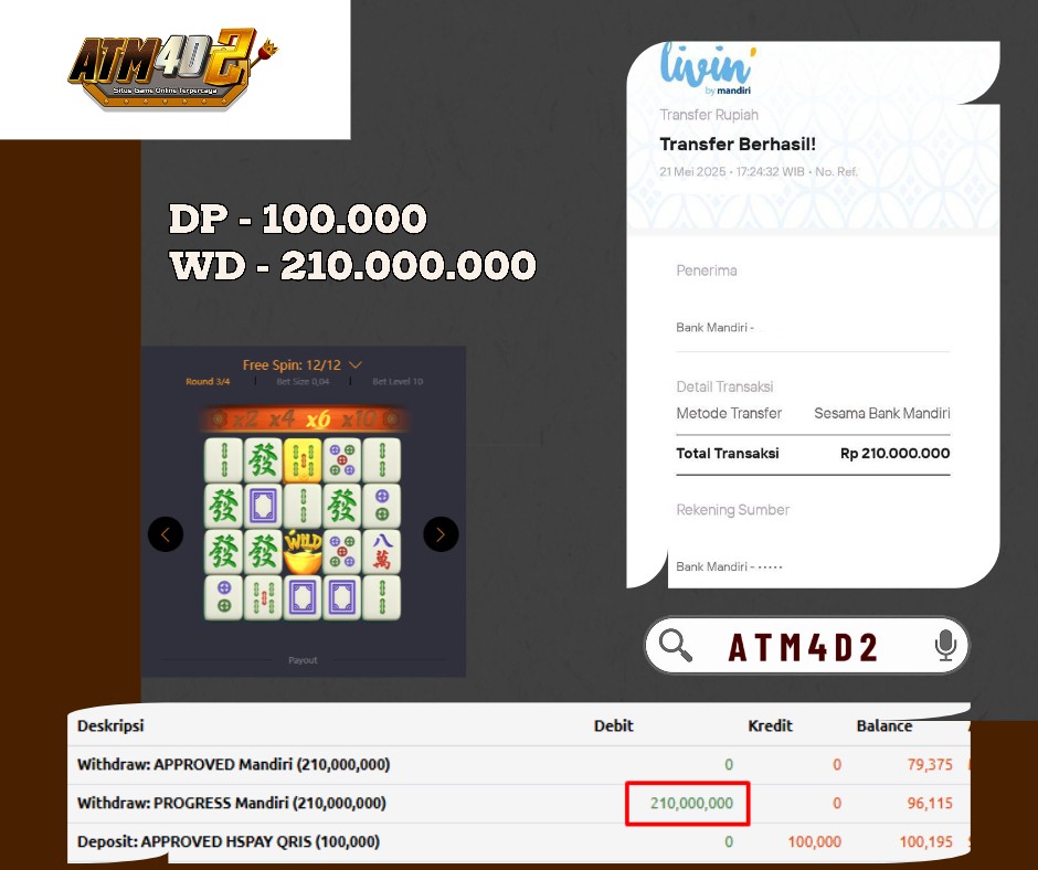 ATM4D2 dikenal sebagai situs terpercaya yang selalu menghadirkan pengalaman bermain slot online yang aman, fair, dan berlisensi resmi. Di sini, kami tidak hanya sekadar memberikan janji, tapi bukti nyata berupa slip kemenangan yang dapat Anda lihat secara langsung.