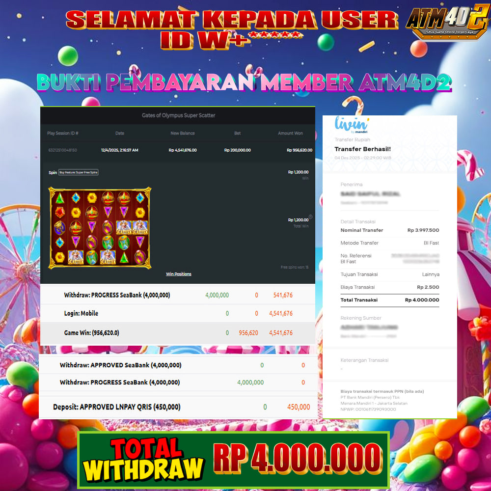 ATM4D2 dikenal sebagai situs terpercaya yang selalu menghadirkan pengalaman bermain slot online yang aman, fair, dan berlisensi resmi. Di sini, kami tidak hanya sekadar memberikan janji, tapi bukti nyata berupa slip kemenangan yang dapat Anda lihat secara langsung.