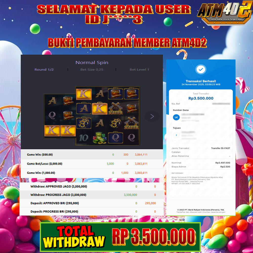 ATM4D2 dikenal sebagai situs terpercaya yang selalu menghadirkan pengalaman bermain slot online yang aman, fair, dan berlisensi resmi. Di sini, kami tidak hanya sekadar memberikan janji, tapi bukti nyata berupa slip kemenangan yang dapat Anda lihat secara langsung.