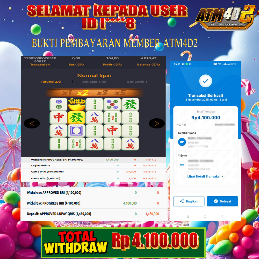 ATM4D2 dikenal sebagai situs terpercaya yang selalu menghadirkan pengalaman bermain slot online yang aman, fair, dan berlisensi resmi. Di sini, kami tidak hanya sekadar memberikan janji, tapi bukti nyata berupa slip kemenangan yang dapat Anda lihat secara langsung.