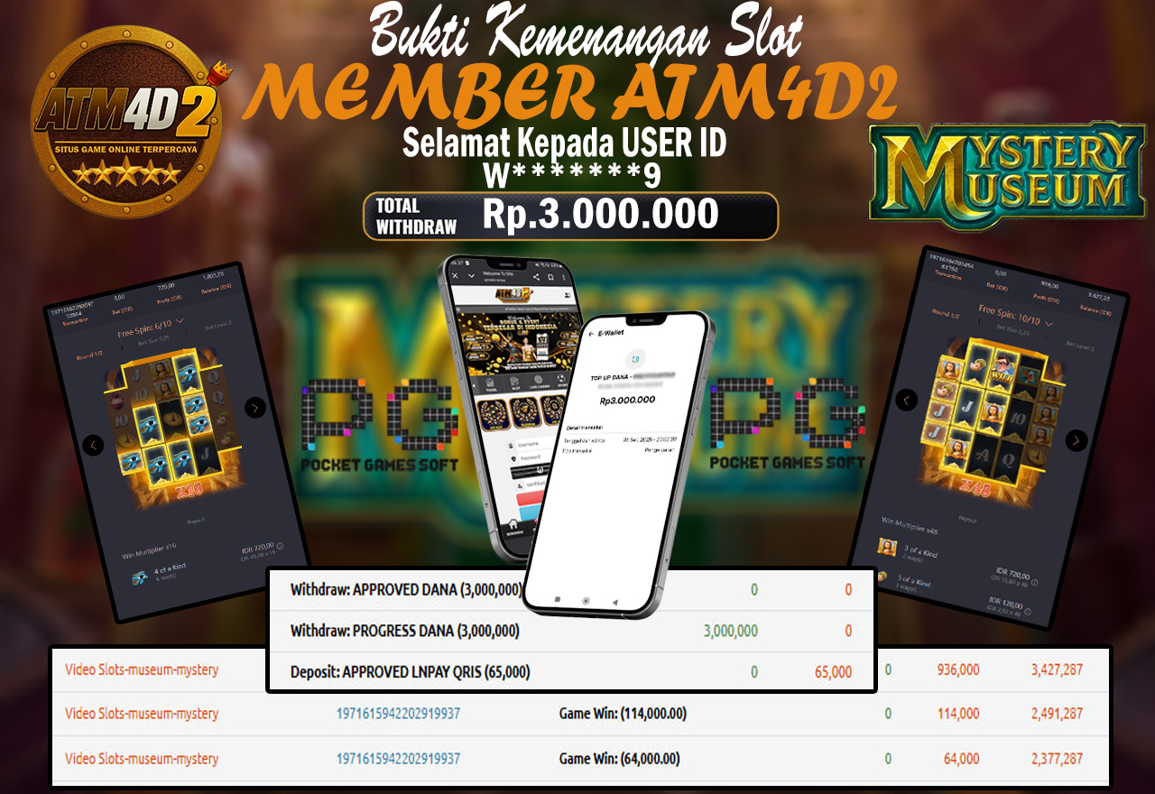 ATM4D2 dikenal sebagai situs terpercaya yang selalu menghadirkan pengalaman bermain slot online yang aman, fair, dan berlisensi resmi. Di sini, kami tidak hanya sekadar memberikan janji, tapi bukti nyata berupa slip kemenangan yang dapat Anda lihat secara langsung.