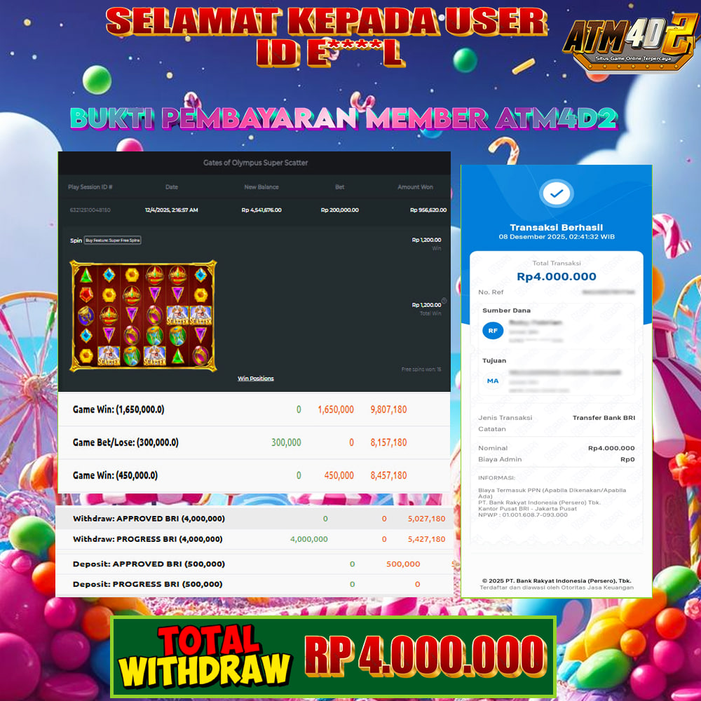 ATM4D2 dikenal sebagai situs terpercaya yang selalu menghadirkan pengalaman bermain slot online yang aman, fair, dan berlisensi resmi. Di sini, kami tidak hanya sekadar memberikan janji, tapi bukti nyata berupa slip kemenangan yang dapat Anda lihat secara langsung.