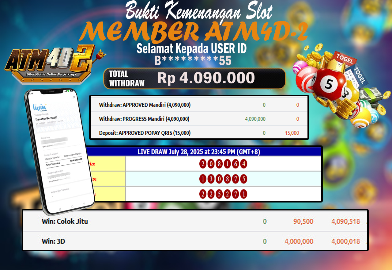 ATM4D2 dikenal sebagai situs terpercaya yang selalu menghadirkan pengalaman bermain slot online yang aman, fair, dan berlisensi resmi. Di sini, kami tidak hanya sekadar memberikan janji, tapi bukti nyata berupa slip kemenangan yang dapat Anda lihat secara langsung.